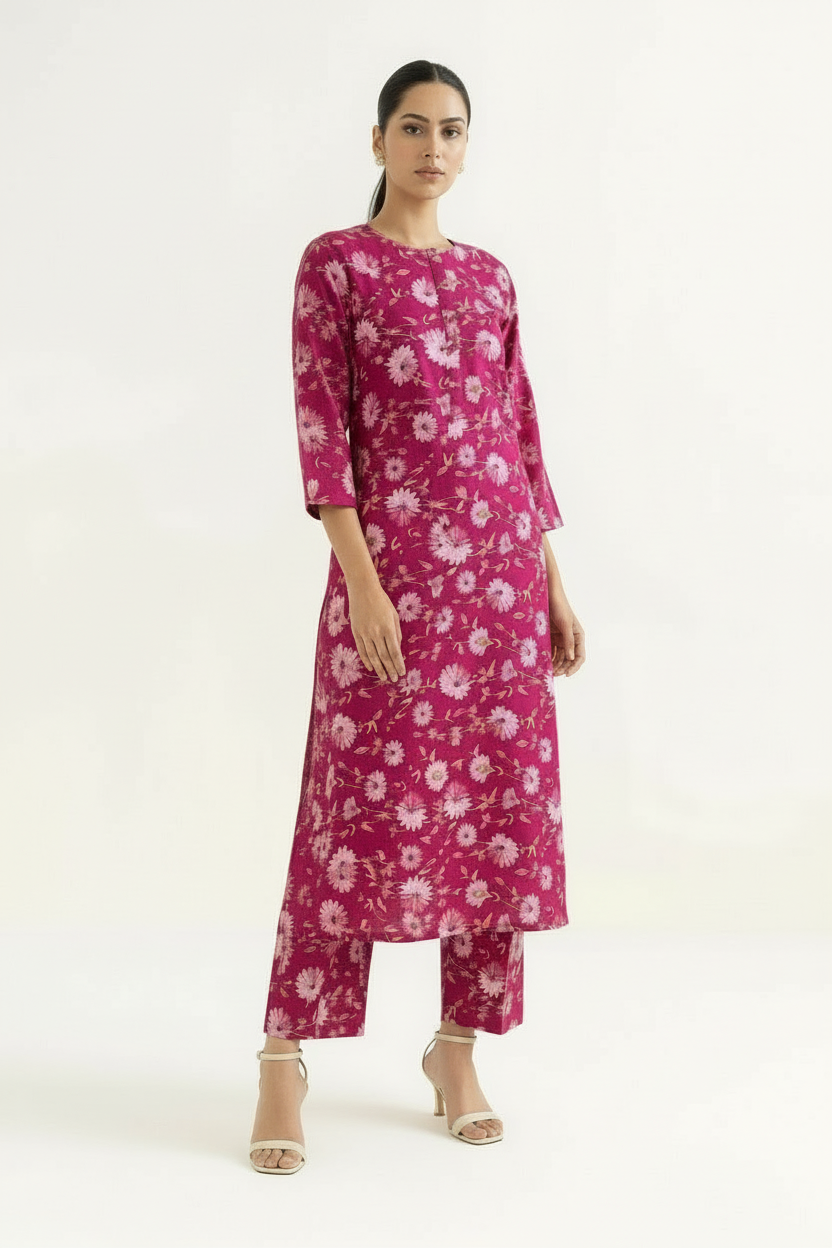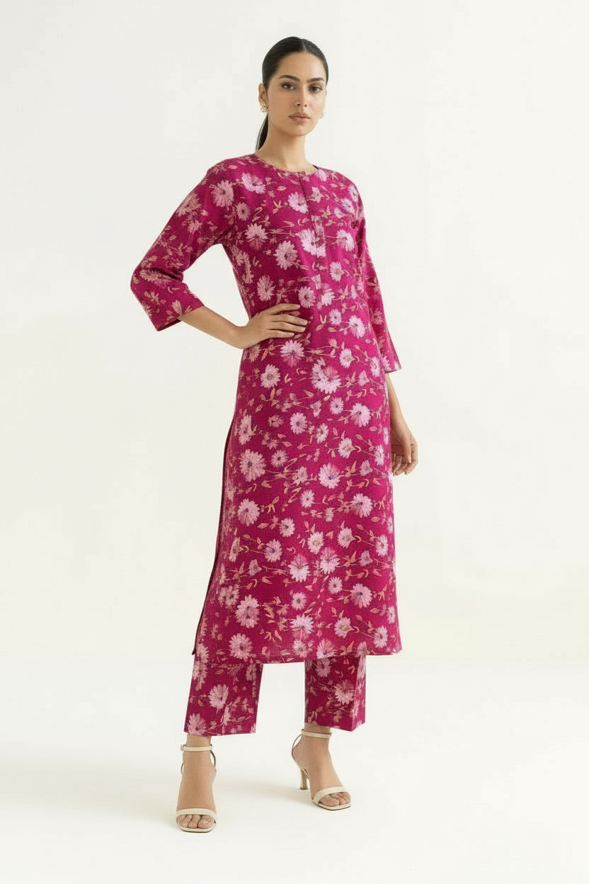 Expertly crafted from premium Linen fabric and featuring high-quality digital printing, our 2 piece set in a striking Pink is perfect for adding a trendy touch to your wardrobe. With its all-over print design, this outfit exudes both style and quality, making it a must-have for any fashion-forward individual.